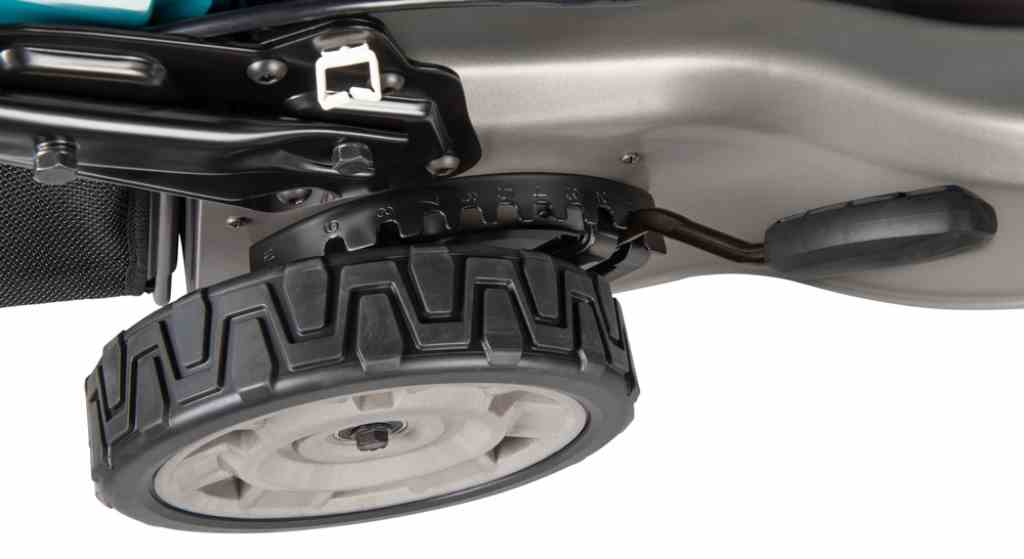 Kosiarka jest wyposażona w 10-stopniową centralną regulację wysokości koszenia, regulowaną za pomocą dźwigni. Wysokość koszenia można ustawić w zakresie od 20 do 100 mm, co daje możliwość dostosowania do różnych typów trawnika. Dodatkowo, kosiarka posiada klasę odporności na wodę IPX4, co daje pewność, że jest bezpieczna w użyciu nawet w czasie opadów deszczu.