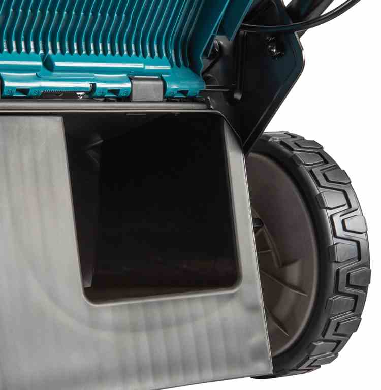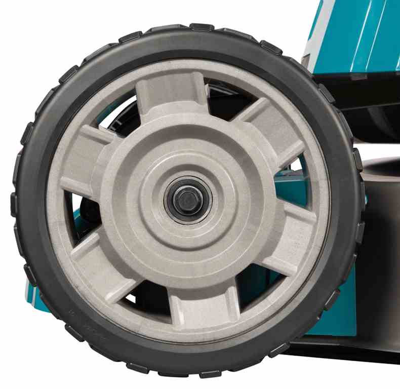Przedni kółka kosiarki są na łożyskach kulkowych, co zapewnia płynne i bezproblemowe prowadzenie po różnym rodzaju nawierzchniach. Szerokie opony zwiększają powierzchnię kontaktu z podłożem, co utrzymuje wyższą wydajność podczas jazdy po błotnistym lub wyboistym terenie. Kosz na trawę ma wbudowany wskaźnik poziomu zapełnienia, co ułatwia kontrolę ilości zebranej trawy.